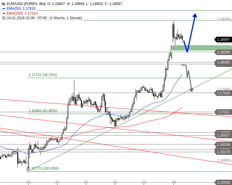 Diese Konsolidierung sollte zumindest zu einem Gapclose oder zu einem Rücksetzer auf den Bereich der Hochs aus dem Dezember 2025 bei 1,1808 bis 1,1804 USD führen. Anschließend wäre aber ein weiterer Rallyschub in Richtung 1,1919 USD und damit an das Hoch aus dem Jahr 2024 möglich. Sollte EUR/USD unter 1,1804 USD abfallen, würden weitere Abgaben in Richtung 1,1774 oder sogar bis 1,1743 USD drohen.