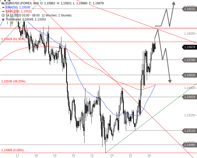 EUR/USD befindet sich seit dem Tief vom 21. November 2025 in einer kurzfristigen Aufwärtsbewegung. Innerhalb dieser zog das Währungspaar ab gestern Mittag deutlich an. Heute Nacht erreichte es das logarithmische 61,8%-Retracement der Abwärtsbewegung ab 13. November bei 1,1593 USD. Im Bereich um 1,1606 USD liegt die nächste wichtige Widerstandszone. Dort verläuft auch der Abwärtstrend seit dem Jahreshoch.
