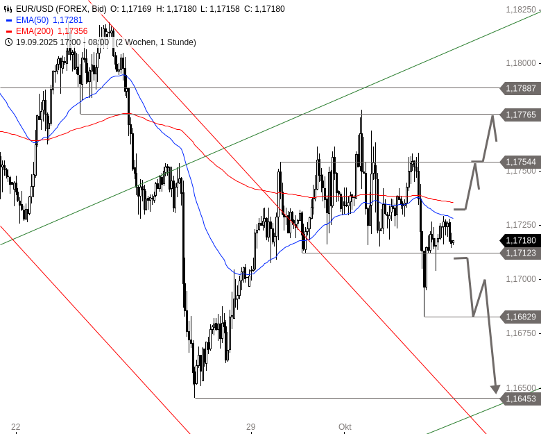 Gelingt EUR/USD ein Ausbruch auf Stundenschlusskursbasis über den EMA50, dann wäre eine weitere Erholung bis 1,1754 USD oder sogar 1,1778 USD möglich. Sollte EUR/USD aber erneut unter 1,1712 USD abfallen, dann müsste mit Abgaben in Richtung 1,1645 USD gerechnet werden.