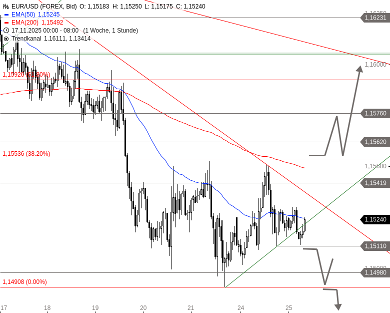 EUR/USD zog gestern bis fast an ein kurzfristiges log. 38,2%-Retracement der Abwärtsbewegung seit 13. November 2025 bei 1,1554 USD. Am Mittag drehte er an diesem Retracement nach unten ab, er fiel auf 1,1511 USD zurück. Seitdem läuft er seitwärts, hat dabei aber einen sehr kurzfristigen Aufwärtstrend gebrochen.