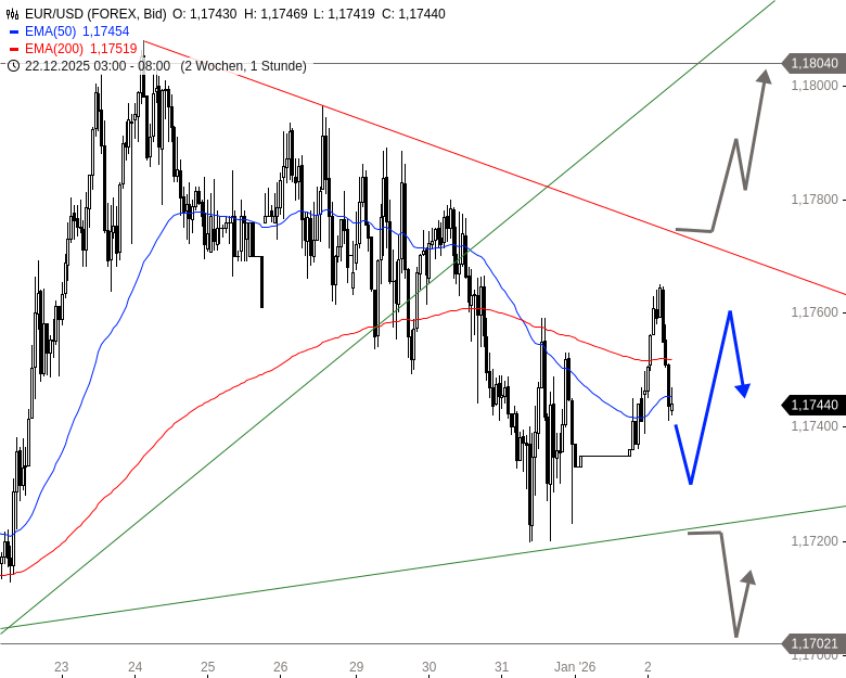 EUR/USD scheiterte am 24. Dezember mit einem Ausbruchsversuch über das Hoch bei 1,1804 USD vom 16. Dezember 2025. Seit diesem Hoch befindet sich das Währungspaar in einer Abwärtsbewegung. Am 31. Dezember setzte es auf einer inneren Trendlinie auf, die bereits am 19. Dezember halt gegeben hatte. Zuletzt zog EUR/USD wieder an und erreichte heute Nacht ein Hoch bei 1,1765 USD. Seit einigen Stunden fällt EUR/USD wieder zurück.