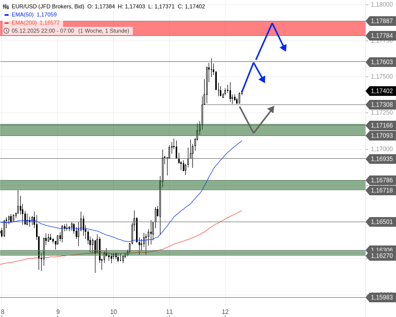 Rückblick: EUR/USD legte in den vergangenen zwei Tagen einen fulminanten Lauf auf das Parkett. Das Währungspaar gelang der Sprung aus einem Aufwärtstrendkanal nach oben, was eine Rallybeschleunigung signalisiert. Ausgehend vom Widerstand bei 1,1760 USD konsolidiert EUR/USD seit einigen Stunden.