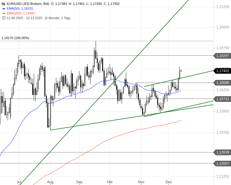 Charttechnischer Ausblick: Ob diese Konsolidierung bereits abgeschlossen ist, dürften wir heute schnell erfahren. Für eine baldige Trendfortsetzung sollte der Support bei 1,1730 USD halten. EUR/USD könnte sich anschließend bis auf 1,1760 und darüber 1,1778/1,1789 USD aufmachen. Unter 1,1730 USD werden dagegen Abgaben in Richtung 1,1710 USD wahrscheinlich. Dort sollten die Bullen dagegenhalten, um die Trendbewegung nicht zu gefährden.