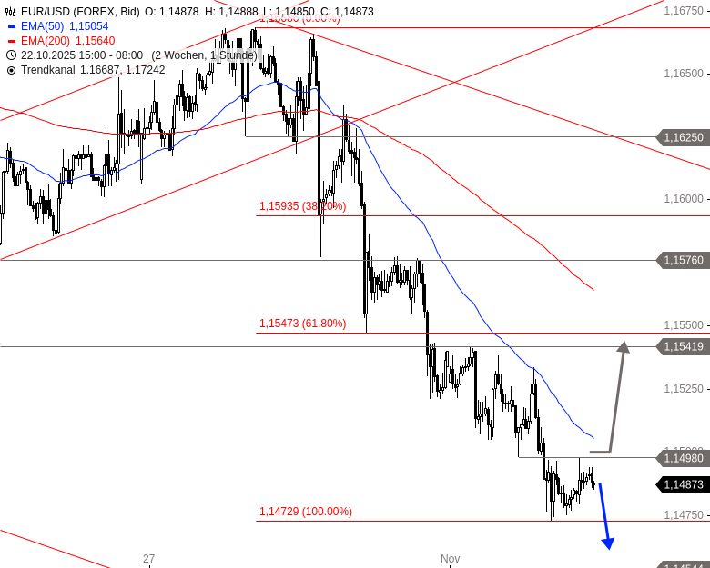 EUR/USD erholte sich gestern zwar zunächst, scheiterte aber bereits am EMA50 (Stundenchart). Danach fiel das Währungspaar bis in den Nachmittag hinein auf ein Tief bei 1,1473 USD weiter ab. Seitdem läuft eine kleine Erholung. Dabei stellte sich bisher das letzte Zwischentief bei 1,1498 USD als zu hohe Hürde heraus.