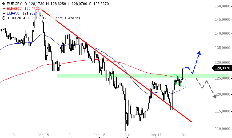 Nach der Pullback-Bewegung an den zuvor gebrochenen Abwärtstrend im April ging es im Frühjahr gen Norden bis an den EMA200 im Wochenchart im Bereich 125,50 JPY.