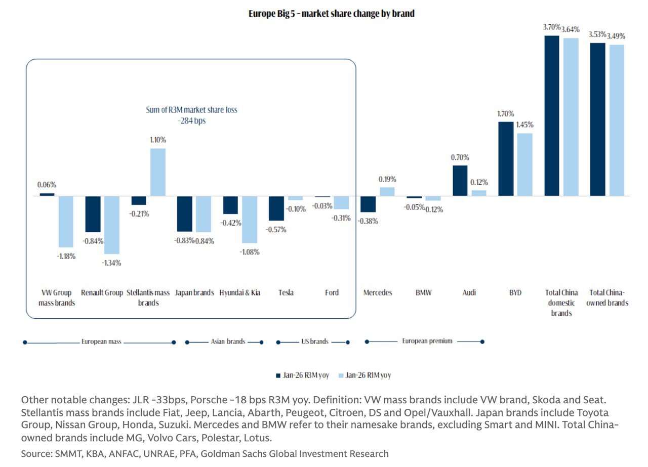 Die etablierten Marken (VW, Renault, Japaner, Hyundai/Kia, Tesla, Ford) haben zusammen 2,84% (284 Basispunkte) des gesamten Marktes in nur 3 Monaten verloren. Dieses Geld und diese Kunden sind fast eins zu eins zu den chinesischen Marken abgewandert.