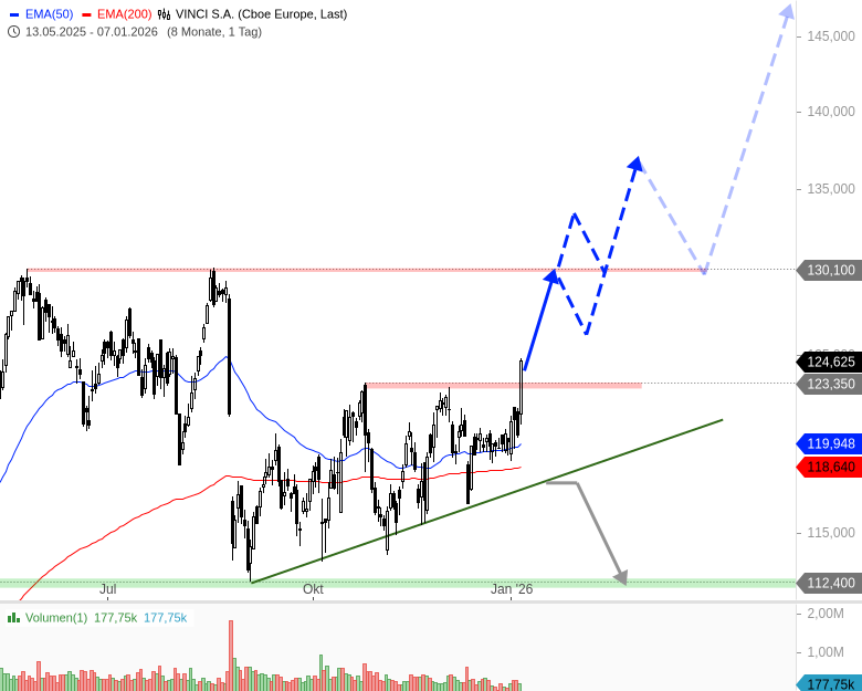 Mit viel Schwung überrennt die VINCI-Aktie heute die Zwischenhochs aus dem Oktober und Dezember. Damit befreit sie sich aus der Stabilisierungsrange der letzten Monate, die sich nach dem Kurseinbruch Ende August ausgebildet hatte.