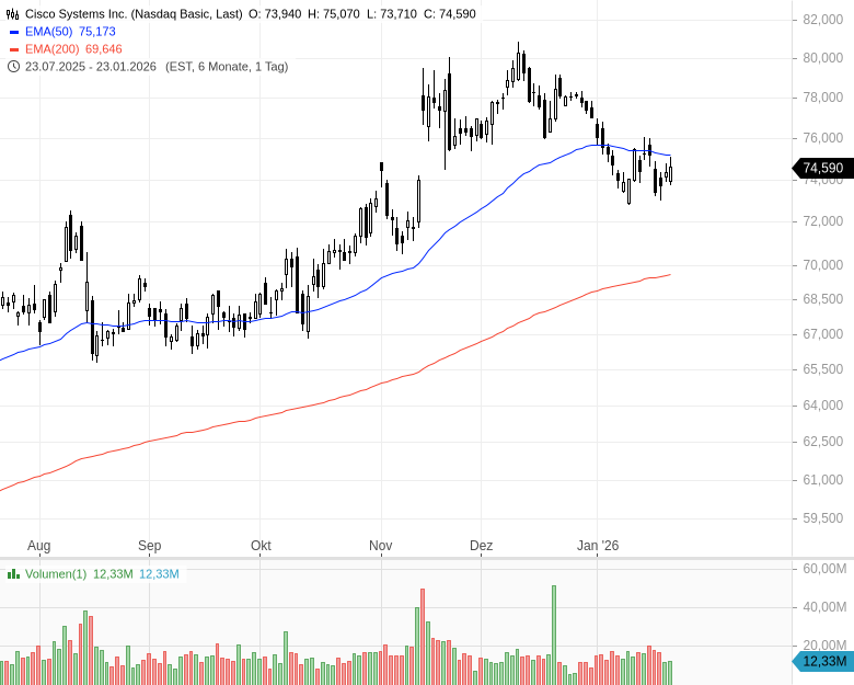 - Cisco Systems Inc.Kursstand: 74,590 $ (Nasdaq) - Zum Zeitpunkt der VeröffentlichungVerkaufenKaufen