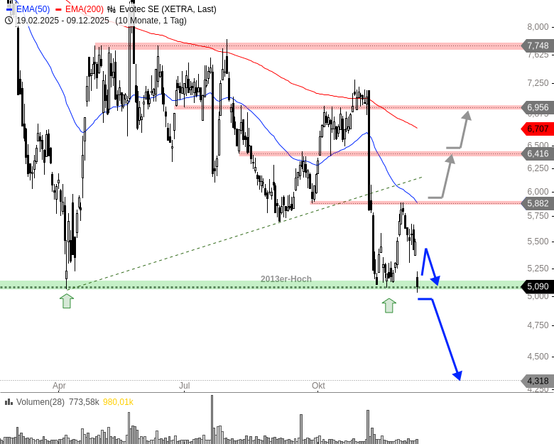 Freundlicher würde sich die charttechnische Situation erst bei einer Rückkehr über 5,90 EUR gestalten. Erst dann wären die Bären zunächst ausgebremst, Erholungspotenzial bis 6,40 - 6,44 und 6,95 EUR würde sich dann eröffnen.