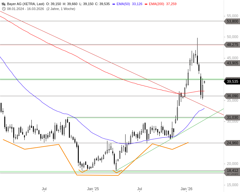 Allerdings hat sich schon nach meiner letzten Analyse gezeigt, wie wichtig das Timing bei den Anteilen von Bayer aktuell ist und wie wenig man sich derzeit auf Kaufsignale verlassen kann: Die damals gelungene Ausbruchsbewegung wurde trotz des vorherigen Aufwärtstrends und der Nachricht, dass ein Sammelvergleich beim Rechtsstreit um Roundup geschlossen werden konnte, sofort wieder abverkauft. Der spätere Bruch der Unterstützung bei 43,20 EUR bildete gleichzeitig den Auftakt für die seither laufende Pullbackbewegung an die gebrochene mittelfristige Abwärtstrendlinie. Ausgehend von einem Zwischentief bei 35,20 EUR versucht man seit letzter Woche, die Aktie wieder zu stabilisieren. Eine positive Reaktion auf die heutige Analysteneinschätzung könnte dem Kurs weiteren Auftrieb geben.