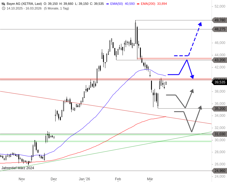 Charttechnisches Fazit: Die Analysteneinschätzung kommt zu einem guten Zeitpunkt, denn die Erholung der letzten Tage trifft bei 39,91 EUR auf einen harten Widerstand. Die Aktie von Bayer dürfte entsprechend mit einem Anstieg über 40,36 eine Erholung bis 43,20 EUR starten. Der Abverkauf seit Mitte Februar wäre allerdings erst bei Kursen um 44 EUR gekontert.
