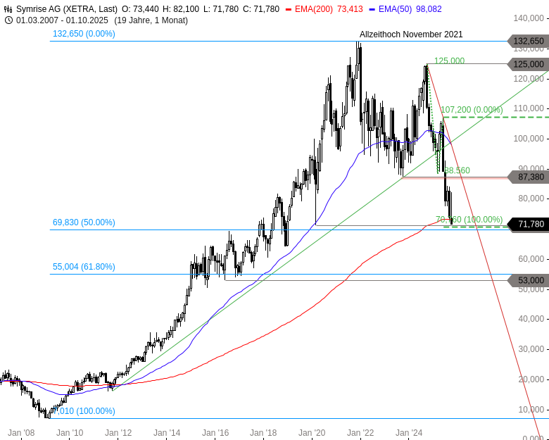 Eine weitere 100%-Projektion hat noch größeren Einfluss: Die Strecke seit dem Hoch von Anfang Juni besitzt bei 71,60 EUR die gleiche Länge, wie die große Abwärtstrendphase von Oktober 2024 bis zum Tief aus dem März.
