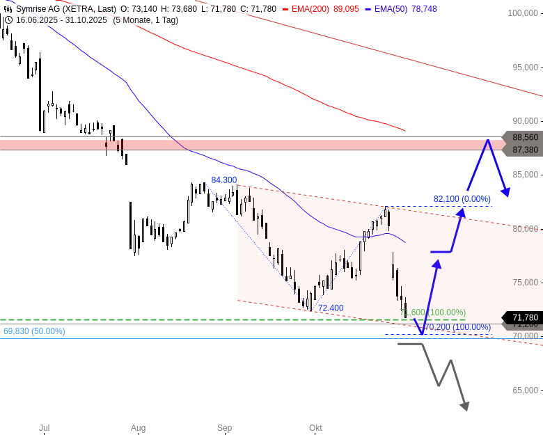 Charttechnisches Fazit: Die Verteidigung der Zone von 69,83 bis 72 EUR ist essenziell für den Beginn einer Trendwende bei der Aktie von Symrise, die bei einem Anstieg über 78 EUR Gestalt annehmen und in den nächsten Wochen bis 89,40 EUR dürfte.