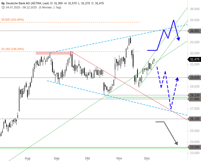 Charttechnisches Fazit: Die Aktie der Deutschen Bank könnte die Risiken, die sich durch die bärische Dreiecksformation und die kurzfristige Flagge auftun, durch einen Anstieg über 32,16 EUR vermeiden und auf neue Jahreshochs bei 34,05 bis 34,82 EUR steigen.