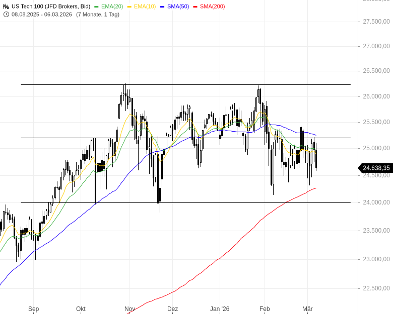 Der NASDAQ fällt unter seine 200-Tage-Linie und stößt bei 24.000 Punkten an die Unterseite seiner Range. Ob er von hier eine schnelle Gegenbewegung startet oder weiter fällt, lässt sich kaum vorhersagen. Ich würde mit einem Überschießen rechnen, aber ob das vor einer Gegenbewegung stattfindet oder danach, ist nicht absehbar.