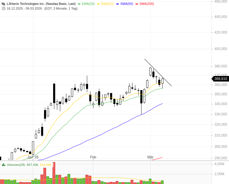 L3Harris – (EMA-Reclaim) Der Kurs des Rüstungskonzerns konsolidiert an den gleitenden Durchschnitten. Bei einem Ausbruch über das Hoch vom Freitag wäre die Aktie handelbar. Einen Kauf mache ich im derzeitigen Umfeld aber von der allgemeinen Marktdynamik abhängig.