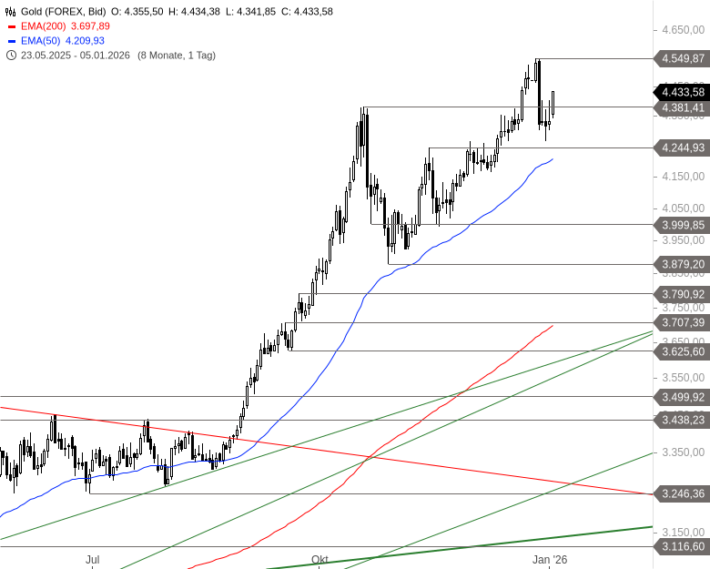 Etabliert sich der Goldpreis wieder über 4.381 USD, dann wäre eine weitere Rally gen 4.650 USD und später sogar ca. 5.000 USD möglich. Sollte er aber unter 4.244 USD abfallen, müsste mit weiteren Abgaben in Richtung 3.999 oder sogar 3.879 USD gerechnet werden.