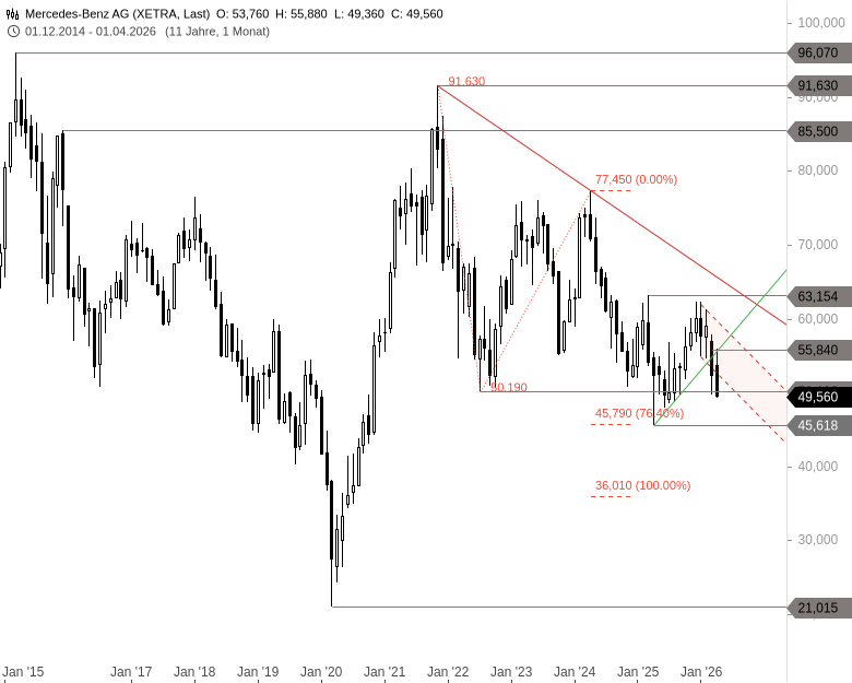 Diese Variante würde dennoch erlauben bzw. in Aussicht stellen, dass auf Höhe von 43,50 bis 45 EUR ein steiler Konter den großen Abwärtstrend der Mercedes-Benz-Aktie beendet und eine mittelfristige Erholung beginnt. Möglicherweise startet ein solcher "Washout" schon jetzt und findet nach der Veröffentlichung der Quartalszahlen am 29. April seinen Höhepunkt.