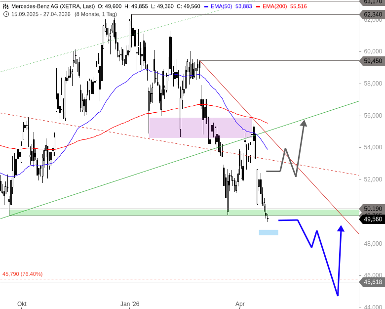 Für die These der verkürzten Abwärtstrendphase bis rund 48,50 EUR spricht lediglich die starke Erholung seit Ende März, in deren Verlauf es zu einer Überschneidung mit den Tiefs der ersten Abwärtstrendphase kam (im Chart violett markiert). Dies ist aber tatsächlich der sprichwörtlich "letzte Strohhalm" für die Mercedes-Benz-Aktie und die Chance auf eine rasche Erholung.