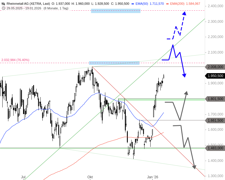 In diesem Fall könnte ein Anstieg bis 2.150 EUR folgen, dort allerdings eine größere Korrektur einsetzen, welche durchaus wieder bis 1.800 EUR führen kann. Durchbricht die Rheinmetall-Aktie auch das Gebiet um 2.150 EUR könnte sich der Aufwärtstrend auf 2.260 EUR und darüber bis an das nächsthöhere Projektionsziel bei 2.372 EUR ausdehnen.