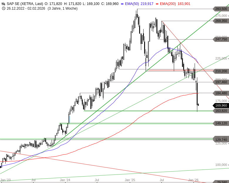 Mittlerweile hat dieser auch die bis ins Jahr 2022 zurückreichende Aufwärtstrendlinie durchbrochen und den Titel mit dem impulsiven Abverkauf seit dem Hoch vom 13. Januar bei 219,06 EUR an den Rand einer weiteren großen Abwärtsbewegung und eines mittelfristigen Verkaufssignals gebracht.