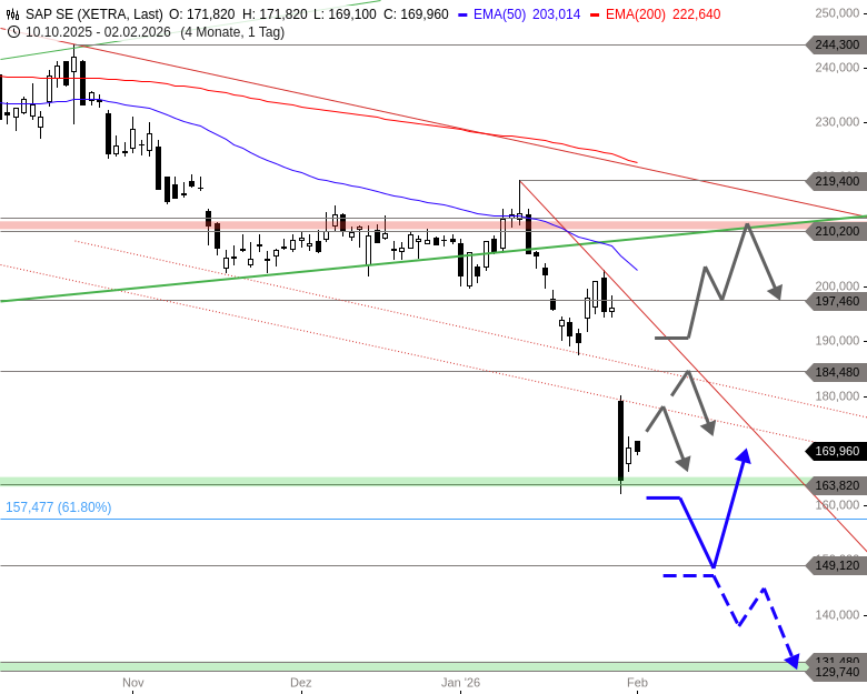 Charttechnisches Fazit: Kurzfristig könnte die Aktie von SAP noch ein paar Tage seitwärts laufen. Doch schon Kurse unterhalb von 163,82 EUR dürften den nächsten Abverkauf Richtung 149,12 EUR auslösen. Dort gäbe es die Chance auf eine stärkere Erholung.