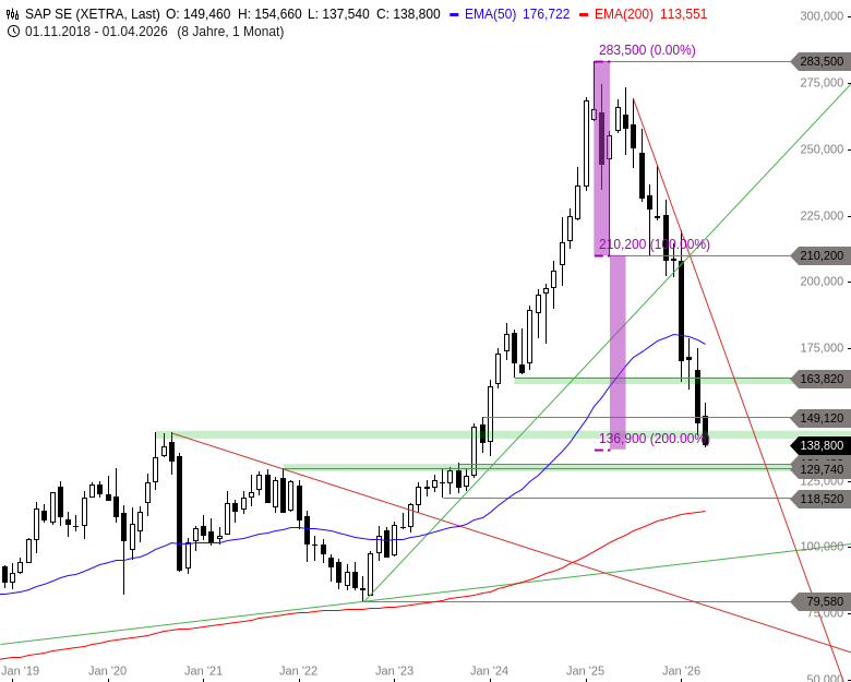 Für den theoretisch möglichen Fall, dass der Abverkauf der letzten Monate direkt am Allzeithoch bei 283,50 EUR begonnen hat (und nicht erst am Hoch aus dem Juni 2025 bei 273,55 EUR), könnte jetzt ein markanter Zielpunkt dieser Abwärtstrend-Phase erreicht sein. Denn trägt man die initiale Korrektur bis 210,20 EUR an eben dieses Tief nach unten ab, erhält man 136,90 EUR als exaktes Projektionsziel. Hier weisen beide Abwärtsspannen die gleiche Länge auf (vgl. violette Markierungen im oberen Chart).