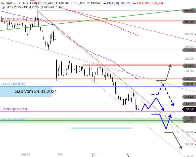 Der große Kurssturz der letzten Monate, der mit dem Bruch der zentralen Unterstützung bei 210,20 EUR im November letzten Jahres und dem Abverkauf unter die mittelfristige Aufwärtstrendlinie Anfang Januar gleich zwei übergeordnete Verkaufssignale ausgelöst hatte, ließ die SAP-Aktie zuletzt wie erwartet auch unter den Support bei 163,82 EUR in das große Aufwärts-Gap vom 24. Januar 2024 fallen.
