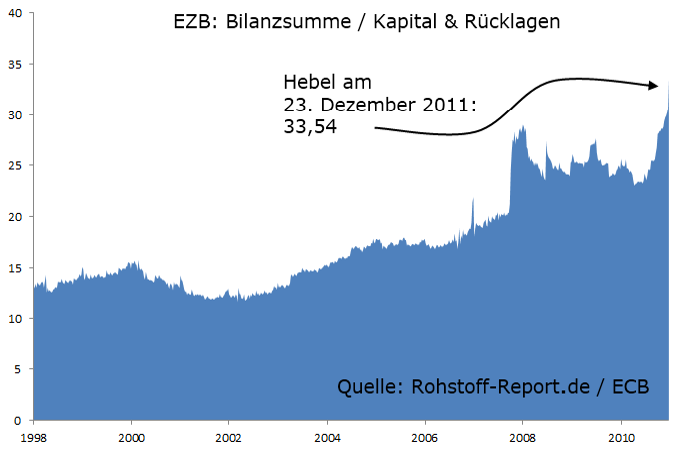 Zum anderen sieht der Markt die Bilanz der EZB zunehmend kritisch. Die Bilanz der EZB hat sich im Dezember – auch durch die Vergabe von längerfristigen Refinanzierungsgeschäften um über 300 Milliarden Euro auf 2733 Milliarden Euro vergrößert – damit ist die Bilanz größer, als die der Federal Reserve – jene der Fed stand per 7. Dezember 2011 bei umgerechnet 2177 Milliarden Euro. Stellt man bei der EZB die Bilanzsumme der Summe aus Kapital und Rücklagen gegenüber, so arbeitet sie mit einem Hebel von 33,7 – das übersteigt selbst den Lehman-Hebel. Trotz der Tatsache also, dass alle Welt nach der EZB-Bazooka rief und enttäuscht verkaufte, als die EZB dem unbegrenzten Aufkauf von Staatsanleihen eine Absage erteilte, verlängert die EZB ihre Bilanz deutlich, so deutlich, dass einige Marktbeobachter ihre Stabilität beginnen anzuzweifeln.