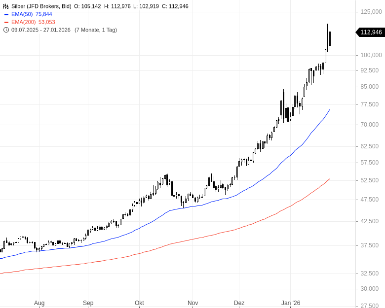 Die Rally beim Silberpreis scheint kein Ende zu finden: Auf Sicht von zwei Monaten hat sich der Silberpreis verdoppelt und auf Sicht von sechs Monaten sogar ungefähr verdreifacht. In der vergangenen Nacht stieg Silber zeitweise bis auf über 117 USD je Feinunze, nachdem die Marke von 100 USD erst am Freitag geknackt worden war.