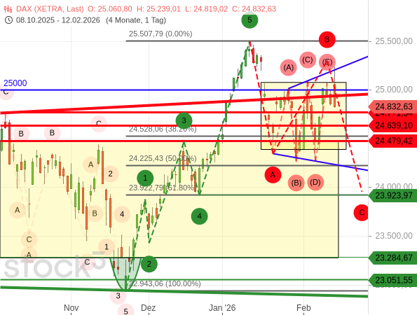 Wer es spekulativ mag, könnte jetzt allerdings doch wieder mit einem Short-Trade auf eine Fortsetzung der Seitwärtskonsolidierung bzw. auf das Elliott-Wellen-Szenario einer Welle C setzten, da auch die US-Indizes heute deutliche Schwäche zeigen und diese damit im kurzfristigen Bereich auch stark angeschlagen sind.