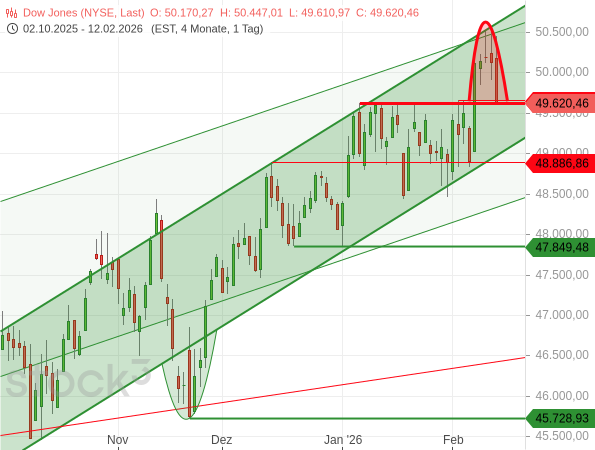 Daher könnte man nun auch beim Dow Jones über einen Short-Versuch nachdenken, wenn die Marke von 49.620 Punkten klar unterschritten wird. Da man sich damit aber gegen einen bislang sehr starken Aufwärtstrend stellt, gilt auch ein solcher Trade als spekulativ!
