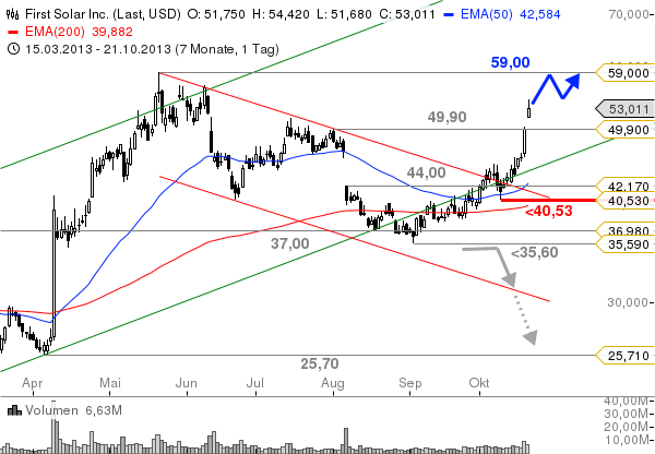 Seit der letzten Analyse zu First Solar hat sich einiges getan. Die Aktie schaffte die Rückeroberung der Aufwärtstrendlinie und brach in der Folge auch aus dem sekundären Abwärtstrendkanal aus. Das erste Ziel bei 49,90 $ wurde im Anschluss zügig erreicht, mit den heutigen Kursgewinnen ist auch das Jahreshoch bei 59,00 $ nicht mehr weit entfernt. Konsolidierungen sollten von nun an nicht mehr unter 40,53 $ gehen. Die Rallybewegung sollte in den kommenden Wochen bis zum Hoch bei 59,00 $ fortsetzen. Kurse darüber würden langfristig auch wieder Notierungen über 100,00 $ ermöglichen. Dies ist aber noch Zukunftsmusik.
