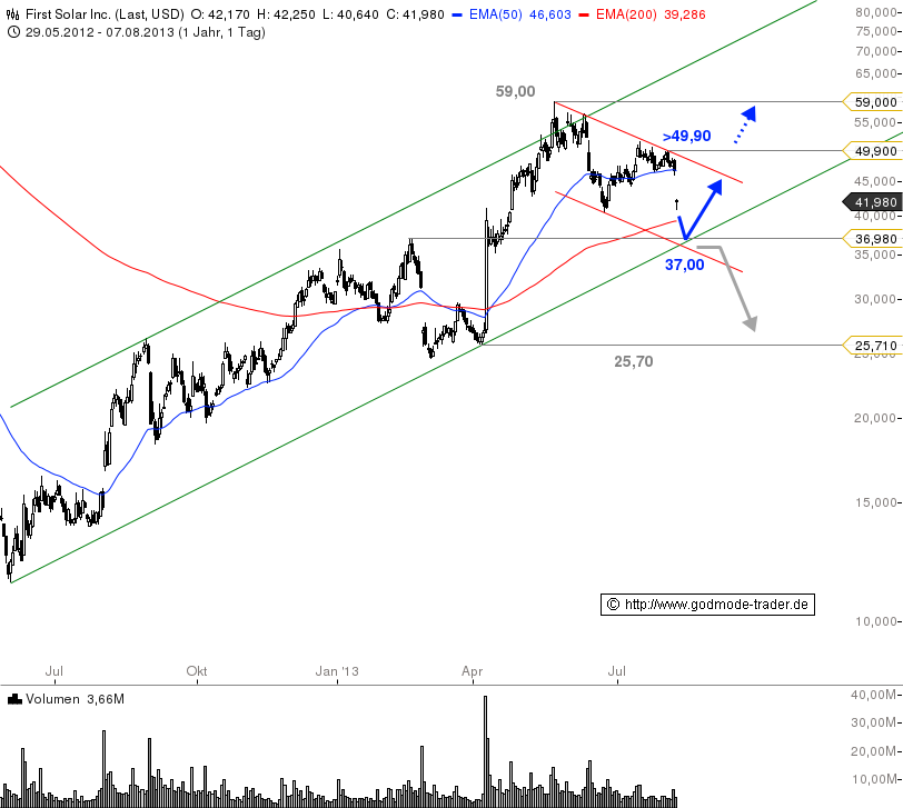 Die Aktie von First Solar kommt heute kräftig unter Druck. Die Marktteilnehmer reagieren verschnupft auf die gestern nachbörslich vorgelegten Halbjahreszahlen. Aus charttechnischer Sicht hat sich bei dem Titel über die letzten Wochen eine Flagge ausgebildet. Der Wert nähert sich bereits der unteren Flaggenbegrenzung wie auch dem EMA200 als erste Unterstützung an. Ein wichtiges Kurslevel liegt bei 37,00 $. Hier treffen der langfristige Aufwärtstrend und eine horizontale Unterstützung aufeinander. Ein Rebound in diesem Kursbereich ist also wahrscheinlich,