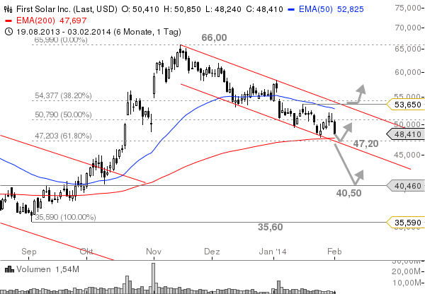 Die Aktie von First Solar hat bereits im November 2013 und damit deutlich vor den großen Indizes ein markantes Hoch erreicht und fällt seither nahezu lehrbuchmäßig in einem Abwärtstrendkanal. Der EMA200 auf Tagesbasis leitete in der Vorwoche eine Erholung ein, die heute aber bereits wieder nahezu vollständig abverkauft wurde. Bei 47,20 $ liegt im Chart eine Schlüsselunterstützung in Form des klassischen 61,8%-Fibonacci-Retracements über die Aufwärtsstrecke von 35,60 $ auf 66,00 $. Knapp darüber verläuft der EMA200, knapp darunter die untere Trendkanalbegrenzung. Somit besteht um die 47,20-$-Marke für die Bullen die letzte Chance, das Ruder noch einmal herumzureißen. Erholungen könnten noch einmal in Richtung 51,00 $ gehen, doch erst über 54,00 $ und damit über der Abwärtstrendlinie würde sich das Bild aufhellen.