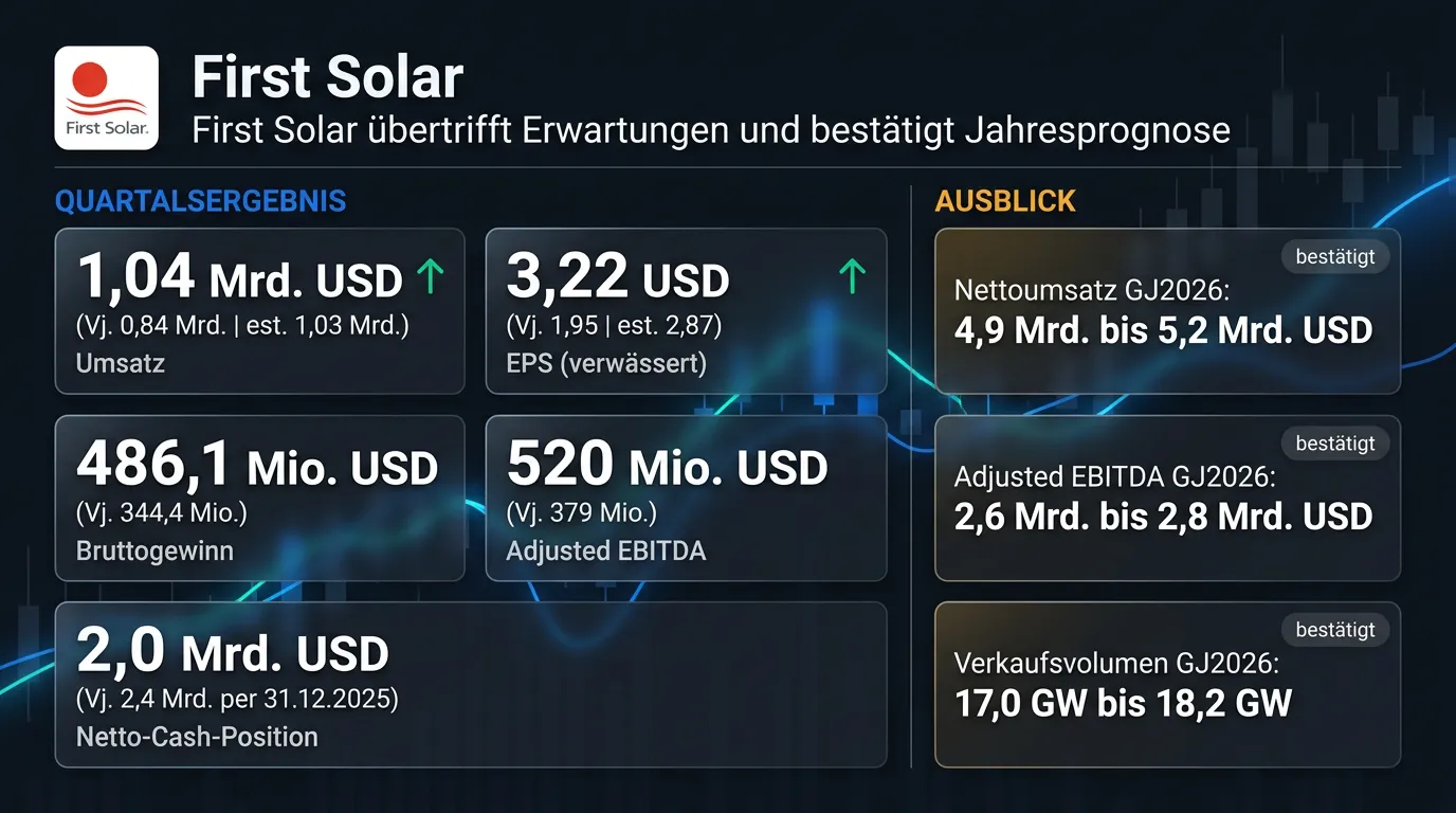 First Solar hat im ersten Quartal 2026 einen Umsatz von 1,04 Mrd. USD erzielt und damit sowohl die Analystenerwartungen als auch den Vorjahreswert um 24 % übertroffen. Der Gewinn je verwässerter Aktie stieg auf 3,22 USD, ein Plus von 65 % gegenüber dem Vorjahresquartal, und übertraf den Konsens deutlich. Das bereinigte EBITDA kletterte auf 520 Mio. USD, verglichen mit 379 Mio. USD im Vorjahreszeitraum. CEO Mark Widmar sprach von einem rekordstarken Quartalsstart mit Rekorderlösen in Indien und spürbarer Margenausweitung. Das Unternehmen bestätigt seine Jahresprognose für 2026 unverändert.