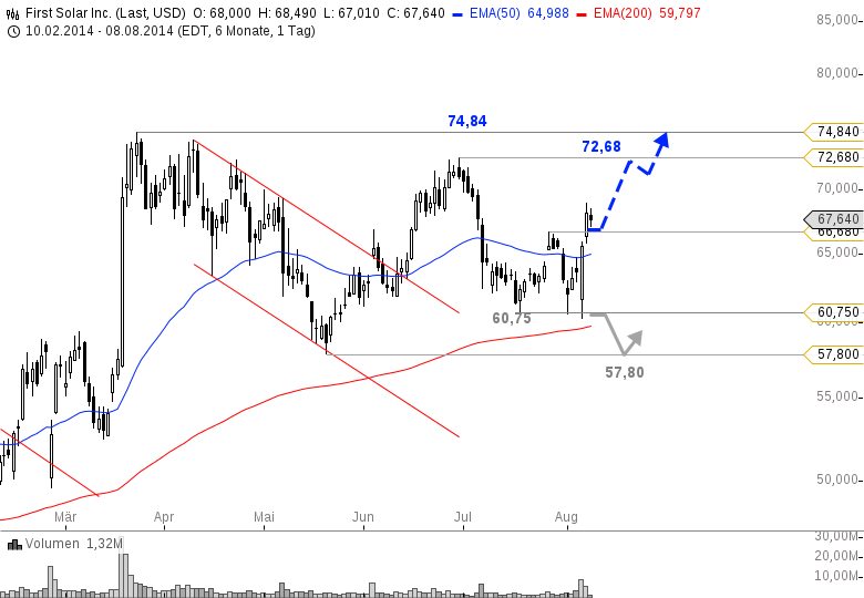 Die Zahlen von First Solar brachten nicht das gewünschte Kaufinteresse. Die Aktie fiel zunächst auf die Unterstützung bei 60,75 $ zurück, verteidigte diese aber ein drittes Mal und drehte noch am gleichen Tag deutlich nach oben ab. Gestern überwand sie den Widerstand bei 66,68 $ und könnte damit die Ziele bei 72,68 und 74,48 $ doch noch abarbeiten. Allerdings sollte hierfür der heutige Kursrücksetzer schnell wieder aufgefangen werden. Ein Rückfall in die Range würde das Chartbild wieder auf neutral stellen. Unterbietet die Aktie hingegen 60,75 $ und gibt sie auch den EMA200 als Unterstützung auf, müssten Anleger mit einem Test des Maitiefs bei 57,80 $ rechnen.