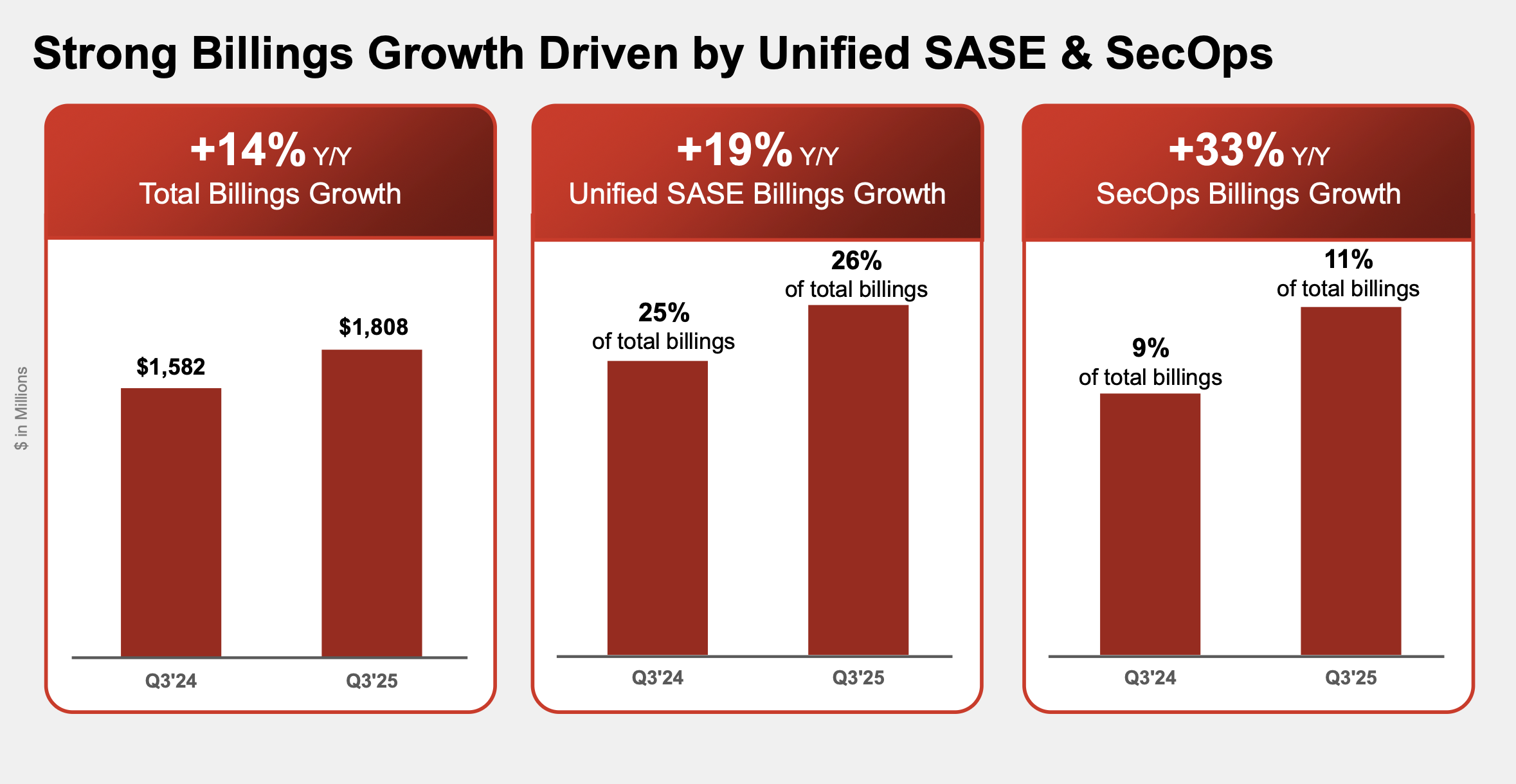 Die Billings als zentrale Steuerungsgröße für künftige Umsätze, wuchsen um 14,3 % auf 1,81 Milliarden Dollar. Innerhalb der Billings stach das AI-driven SecOps-Segment mit 33 % Wachstum hervor und repräsentiert nun 11 % der Gesamt-Billings (+ 2ppt).