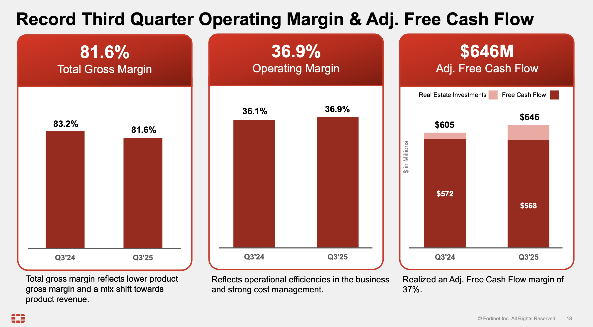 Im dritten Quartal kaufte Fortinet 23,3 Millionen Aktien für 1,83 Milliarden Dollar zurück, was die Aktienanzahl um 3 %. Diese massive Rückkaufaktivität treibt das EPS-Wachstum über das organische Gewinnwachstum hinaus.