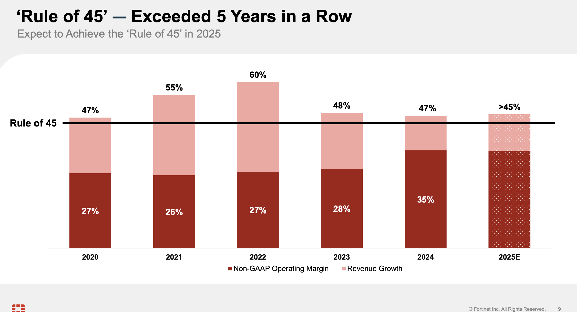 Damit bleibt Fortinet auf Kurs, zum sechsten Mal in Folge die sogenannte „Rule of 45” zu erreichen, also die Summe aus Umsatzwachstum und Betriebsmarge über 45 %. Alles andere wäre aber auch sehr enttäuschend, denn Fortinet ist trotz des Rücksetzers bei den Wachstumsraten (trotz der Profitabilität) kein Schnapper.