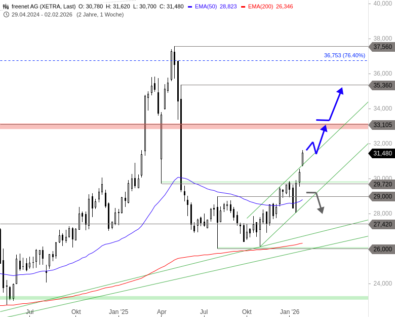 Anfang November gelangen der Käuferseite damit aber die Ausbildung eines bullischen Doppelbodens, der mit dem Anstieg vom Dezember aktiviert wurde. Ein Ausbruch über das Widerstandsniveau bei 29,72 EUR war jedoch nicht von Erfolg gekrönt. Es bedurfte einer leichten Zwischenkorrektur Anfang Januar, damit die sich abzeichnende Erholungschance auch von der Käuferseite genutzt werden konnte. Seither zieht die Freenet-Aktie aber mit hoher Geschwindigkeit nach Norden. Am vergangenen Montag stieg der Kurs sogar über die Oberseite des Aufwärtstrendkanals der letzten Wochen an und bestätigte damit den gelungenen Ausbruch über 29,72 EUR.