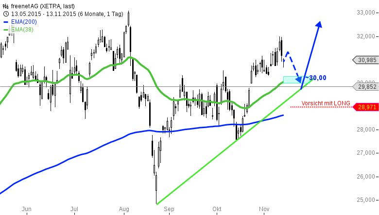 An der 32,00 EUR-Marke stieß sich die Freenet-Aktie zweimal den Kopf an, so dass sich unter diesem Kurslevel etwas Korrekturpotential entfalten könnte.