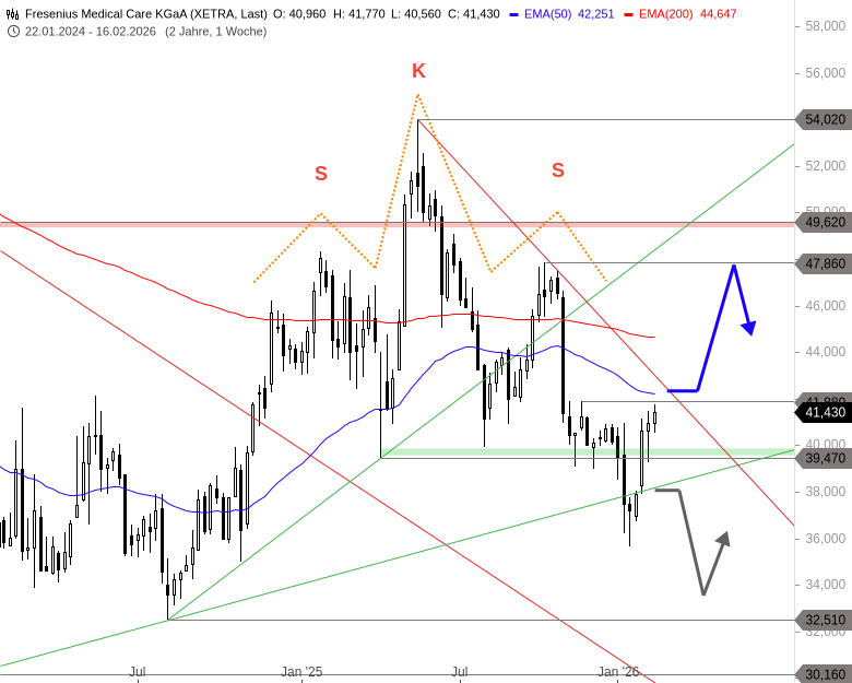 Während die Aktie von Fresenius Medical Care seit Jahren gegen einen übergeordneten Abwärtstrend ankämpft und zuletzt eine bärische SKS-Formation ausbildete, hat sich die Aktie von Fresenius seit Herbst 2022 über 150 % nach oben geschraubt und steht kurz vor einem Kursausbruch, der den langfristigen Abwärtstrend, welcher im Jahr 2017 begann, neutralisieren dürfte.