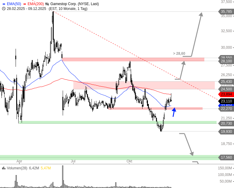 Fazit: Die GameStop-Aktie kämpft weiter um eine Stabilisierung und Trendwende. Die Zahlen sorgen wieder für Verunsicherung bei den Anlegern. Auf der Oberseite würde erst das Überwinden des EMA200, an dem die Erholungen seit Ende Oktober endeten, etwas Hoffnung machen. Von größeren Signalen ist die Aktie auf beiden Seiten noch weit entfernt und bleibt im trendlosen Modus.
