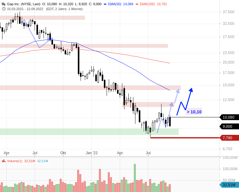 Noch bis Anfang der Woche sah es nicht wirklich düster aus. Zwar ging die Korrektur nach Erreichen des Kurszieles deutlich tiefer, doch die Gap-Aktie hat sich oberhalb der 9 USD-Marke gefangen und startete eine zweite Aufwärtsbewegung. Diese wurde in dieser Woche abrupt beendet. Unterhalb von 10,10 USD kann es jetzt durchaus ein weiteres Tief unter 7,79 USD erfolgen.