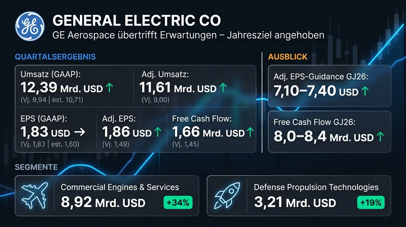 GE Aerospace hat im ersten Quartal 2026 die Analystenerwartungen deutlich übertroffen: Der Gesamtumsatz stieg um 25 Prozent auf 12,4 Mrd. USD, während das bereinigte EPS um 25 Prozent auf 1,86 USD zulegte. Die Aufträge sprangen um 87 Prozent auf 23,0 Mrd. USD, getrieben von einem kommerziellen Services-Rückstand von 170 Mrd. USD. Für das Gesamtjahr 2026 hält das Unternehmen seine Guidance aufrecht und erwartet nun Ergebnisse am oberen Ende der prognostizierten Spannen – das bereinigte EPS soll zwischen 7,10 und 7,40 USD liegen.