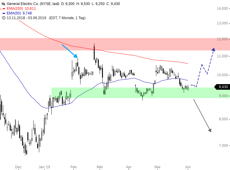Das Fazit der jüngsten Analyse (Pfeil türkis) vom Februar ("GENERAL ELECTRIC - Die Flut hebt alle Boote") lautete: "Nach dem Rutsch unter 6,75 USD im Dezember konnte sich die Aktie des Mischkonzerns in den vergangenen Wochen im Einklang mit der Erholung am Gesamtmarkt wieder erholen. Die Flut hebt bekanntlich alle Boote. Mit dem EMA200 hat die Aktie nun aber den nächsten Widerstand unmittelbar vor der Brust. Wer einen attraktiven Einstieg in den langfristigen Abwärtstrend der Aktie sucht der könnte im Bereich 11,00 bis 11,50 USD fündig werden: Hier ist nach der jüngsten Erholung mit technisch bedingtem Verkaufsinteresse zu rechnen. Der Horizontalwiderstand und der EMA200 dürften eine Nummer zu groß sein für die Bullen."