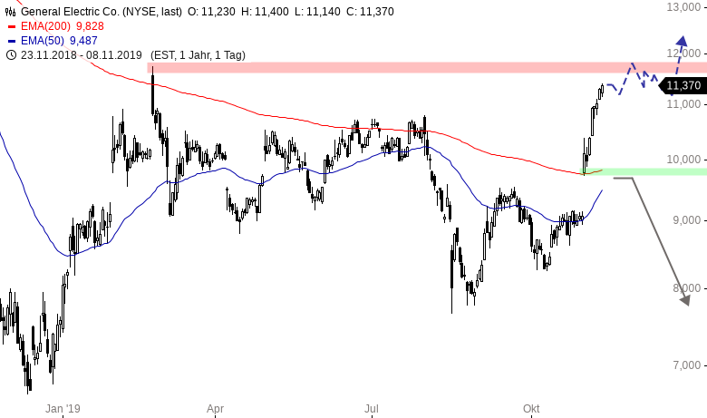 Das Chartbild bei GE hat sich in den vergangenen Wochen wieder deutlich aufgehellt: Mit einem ordentlichen Aufwärtsgap startete die Aktie Ende Oktober in den Handel, direkt oberhalb des wichtigen Widerstands in Form des EMA200 im Tageschart.