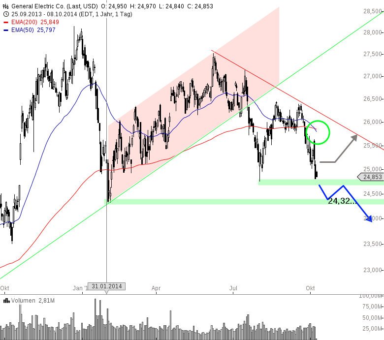 In der General Electric Aktie gab es gleich zu Jahresbeginn einen massiven Ausverkauf - der Wert fiel innerhalb kürzester Zeit von 28,10 $ bis auf den damals gültigen Aufwärtstrend (grün) bei 24,32 $. Ausgehend von diesem Level sahen wir in den darauffolgenden Monaten eine korrektive Erholungsbewegung (Trendkanal rot), welche im Juli von einer neuen impulsiven Abwärtsbewegung abgelöst wurde.
