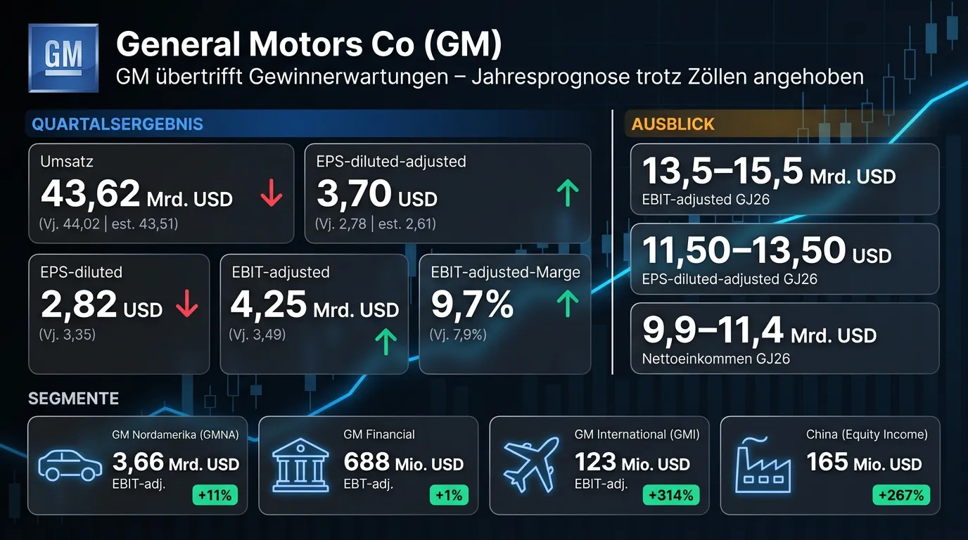 General Motors hat im ersten Quartal 2026 einen Umsatz von 43,6 Mrd. USD erzielt und damit die Analystenerwartungen von 43,5 Mrd. USD knapp übertroffen. Das bereinigte EBIT stieg um 21,9 Prozent auf 4,3 Mrd. USD, während das EPS-diluted-adjusted mit 3,70 USD die Konsensschätzung von 2,61 USD deutlich übertraf. Das berichtete Nettoeinkommen sank hingegen leicht auf 2,6 Mrd. USD, und das verwässerte EPS lag mit 2,82 USD unter dem Vorjahreswert von 3,35 USD, was auf Sondereffekte aus dem Vorjahreszeitraum zurückzuführen ist. GM hebt die Jahresguidance 2026 an und erwartet nun ein bereinigtes EBIT von 13,5 bis 15,5 Mrd. USD sowie ein bereinigtes EPS von 11,50 bis 13,50 USD, gestützt durch ein günstiges US-Gerichtsurteil zu Zöllen, das die Zollbelastung um rund 0,5 Mrd. USD reduziert.